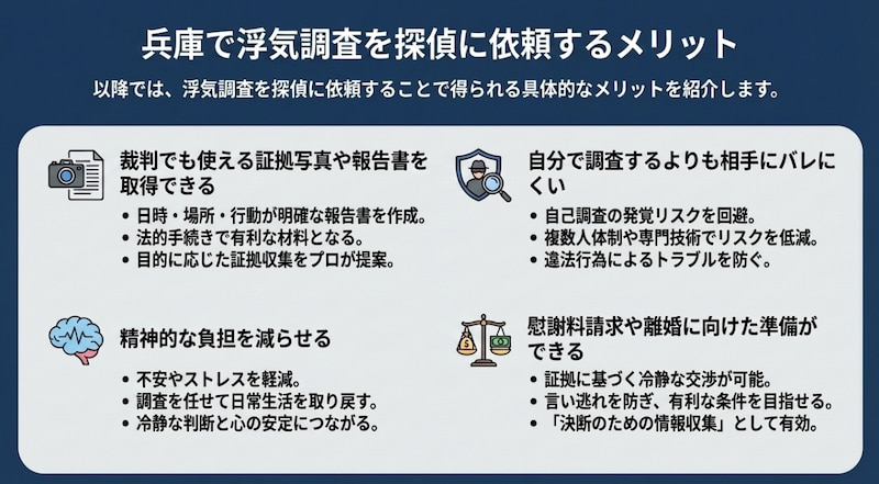 以降では、浮気調査を探偵に依頼することで得られる具体的なメリットを紹介します。