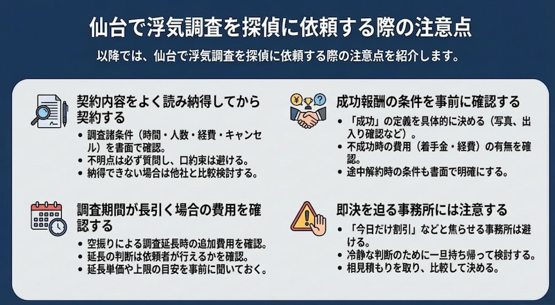 以降では、浮気調査を探偵に依頼する際の注意点を紹介します。