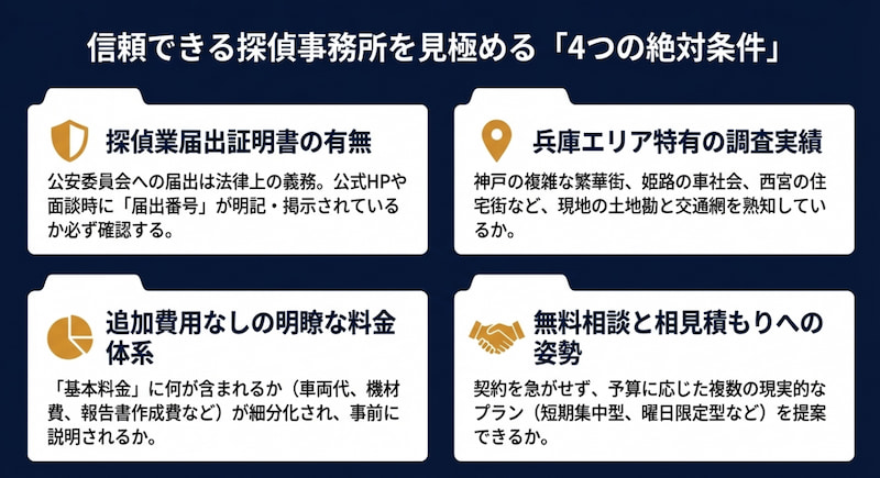 兵庫で浮気調査を成功させるには、探偵業の届出や地域での実績、料金の明確さ、相談のしやすさ、評判の具体性を基準に比較することが大切です。