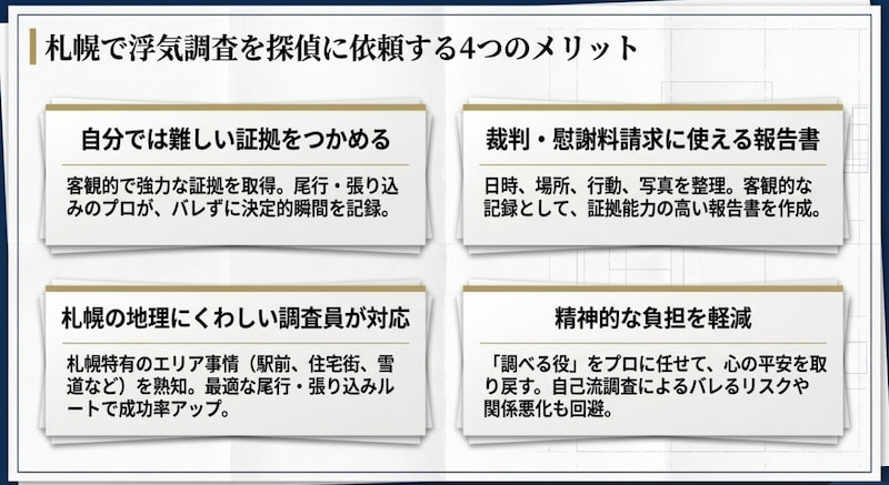 以降では、札幌で浮気調査を探偵に頼むメリットを紹介します。
