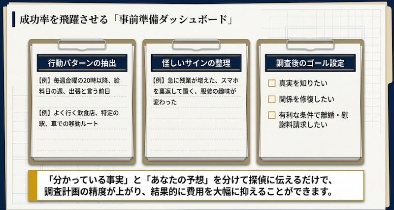 たとえば「帰りが遅い日だけ怪しい」「出張と言って外泊する」など、状況別に狙うべき日時が変わります。