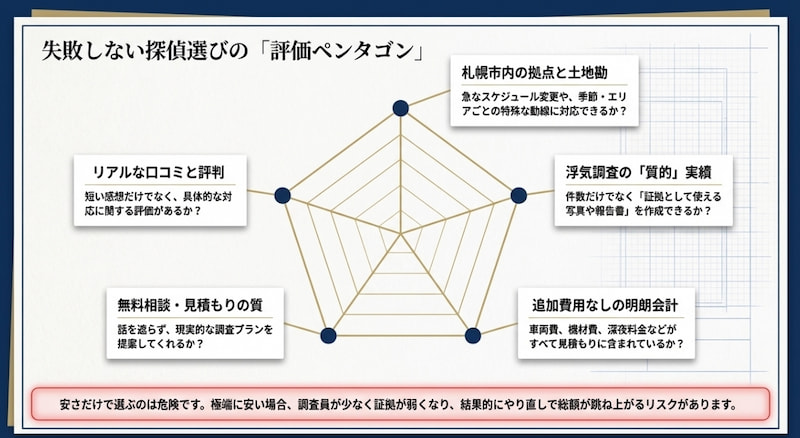 札幌で浮気調査を考えるなら、まずは「土地勘」「実績」「料金の明確さ」「相談のしやすさ」「評判」の5点で比較すると、失敗しにくくなります。