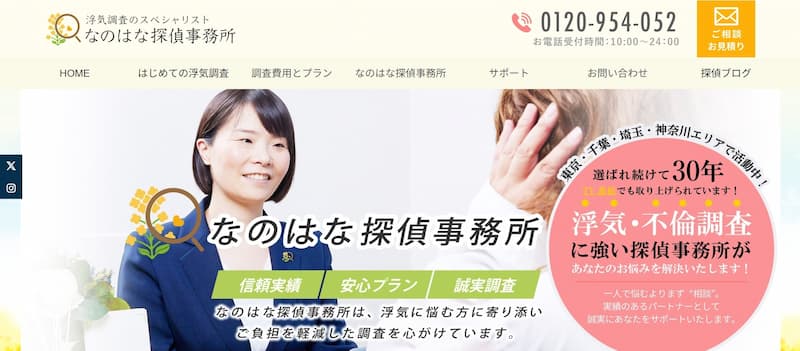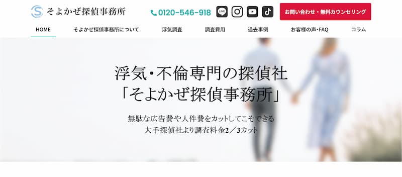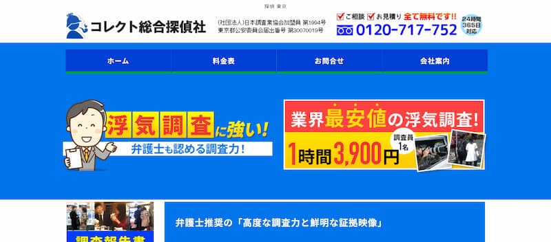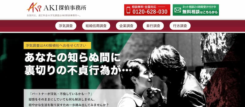 調査項目 | 浮気・不倫調査、素行調査、人探し・行方調査、結婚前信用調査、企業・個人信用調査、盗聴器発見調査、ストーカー調査 |