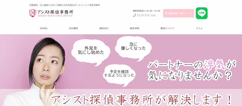 アシスト探偵事務所は、女性代表が運営する東京都北区の探偵事務所です。浮気・不倫調査の実績は1,700件以上あり、女性カウンセラーが在籍しているため、女性からの相談にも安心して対応できます。