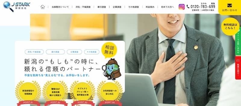経験豊富な調査員による高い調査力で、裁判でも使用できる信頼性の高い報告書を作成してくれます。調査後のアフターフォローも充実しているため、新潟で浮気調査を検討している方におすすめの探偵事務所です。