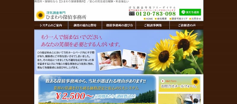 ひまわり探偵事務所は、東京に本社を構え全国48拠点に展開する浮気調査専門の探偵事務所です。1時間2,500円からという業界屈指の低料金で調査を提供し、料金は全国一律で経費込みのため追加費用の心配がありません。
