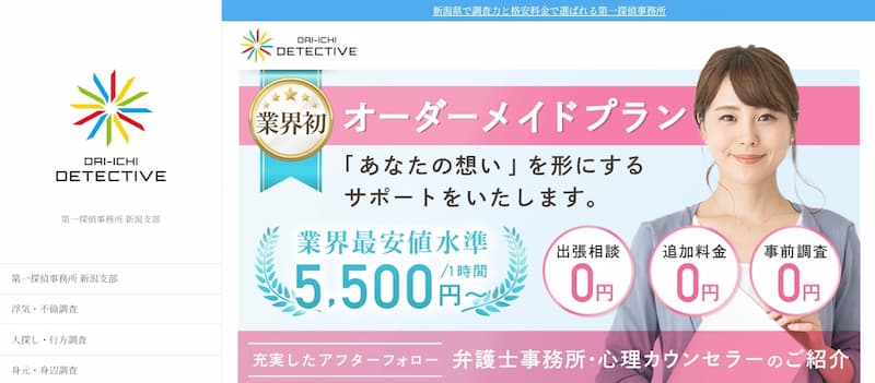 調査後は裁判でも使用できる詳細な報告書を作成し、必要に応じて弁護士の紹介などアフターフォローも充実しています。新潟での浮気調査をリーズナブルに依頼したい方におすすめの探偵事務所です。