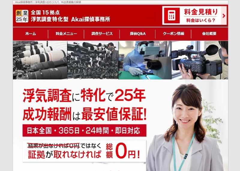 Akai探偵事務所は、平成12年開業、全国15拠点を展開する浮気調査専門の探偵事務所です。光学1400倍ズーム可能なビデオカメラ、5200ルーメンの赤外線投光器など、国内の探偵事務所がほとんど所有していない高性能機材を多数保有し、暗い場所や遠い場所からでも鮮明な撮影が可能です。