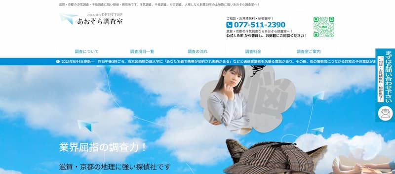 あおぞら調査室は、滋賀・京都の地理に強い地域密着型の探偵社です。探偵業23年の実績があり、滋賀の大津と京都の下京区に営業拠点を置いています。