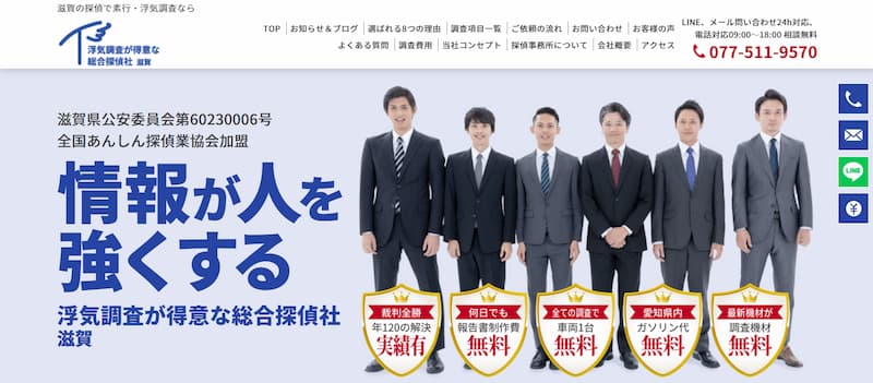 浮気調査が得意な総合探偵社 滋賀は、名古屋本社から業務拡大により設立された全国展開の総合探偵事務所の滋賀支社です。滋賀県大津市に拠点を置き、個人向けの浮気調査から企業向けの信用調査、弁護士からの調査依頼まで幅広く対応しています。