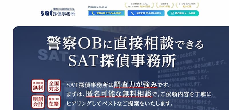 SAT探偵事務所は、警察OBに直接相談できる高い専門性を持つ探偵事務所として京都を含む全国で調査を実施しています。
