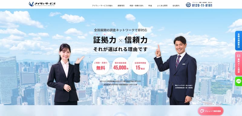 アイヴィ・サービスは2010年創業で、国内15拠点と韓国ソウル支社を含む全国対応の調査ネットワークを持つ大手探偵事務所です。広島支社は広島電鉄銀山町駅から徒歩2分と好立地にあり、年間2万件以上の相談実績を誇ります。
