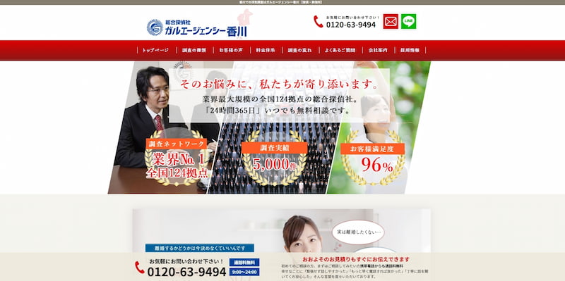ガルエージェンシー香川は、全国124拠点以上のネットワークを持つ業界最大規模の探偵社です。北海道から沖縄まで全国を網羅し、香川県内にも相談室を設置。地域を知り尽くした調査員が地元ならではの土地勘を武器に、迅速で安全な調査を実施しています。