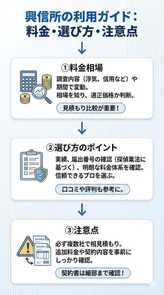 個人信用調査を依頼する際は、信頼できる興信所を選ぶことが大切です。過去の実績や口コミを参考にし、適切な料金設定がされているかも確認しましょう。信頼性の高い興信所に依頼することで、安心して調査を進めることができます。