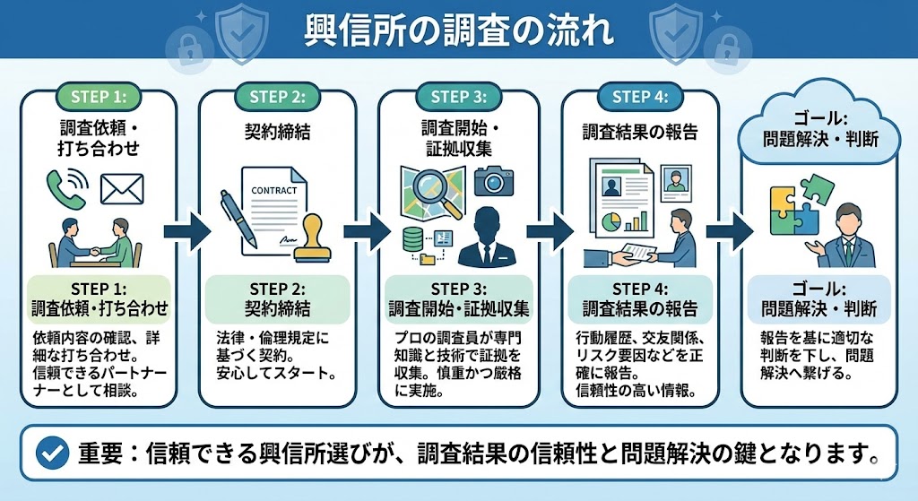 興信所を利用する際の流れを知っておきましょう。まずは調査依頼があり、打ち合わせで詳細を話し合います。その後、契約を結んで調査がスタートします。興信所は信頼できるパートナーとして活用できます。